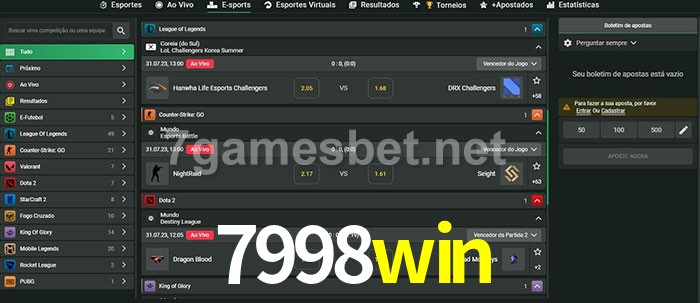 O 7998win oferece uma grande seleção de opções de apostas em e-sports com probabilidades competitivas